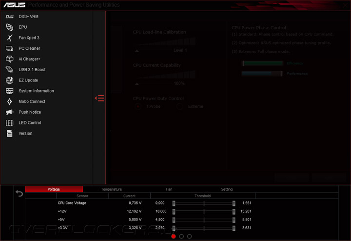 Материнская плата H170 Pro Gaming комплектуется набором разнообразного ПО, в том числе многофункциональным приложением ASUS Ai Suite 3, в состав которого входят модули, служащие для управления параметрами быстродействия, аппаратного мониторинга и много другого. В нижней части оконного интерфейса расположена информационная панель, на которую выводятся показатели системного мониторинга. Кликнув на группу датчиков можно проследить за динамикой изменения параметров в режиме реального времени, а также настроить оповещение по достижению критических значений.