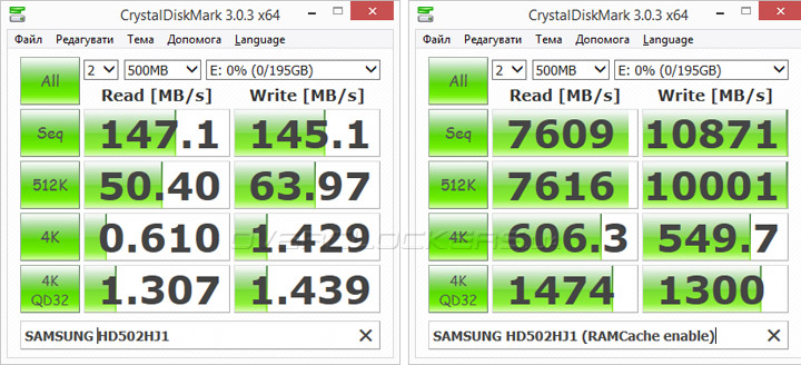 Следуя специальным алгоритмам часто используемая информация с жестких дисков сохраняется в ОЗУ и при повторном вызове считывается с максимальной скоростью. Для проверки эффективности работы RAMCache были проведены измерения в программе CrustalDiskMark. Как говорится, комментарии излишни, правда, в реальных приложениях такое фантастическое быстродействие будет наблюдаться далеко не всегда.
