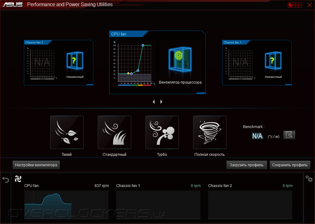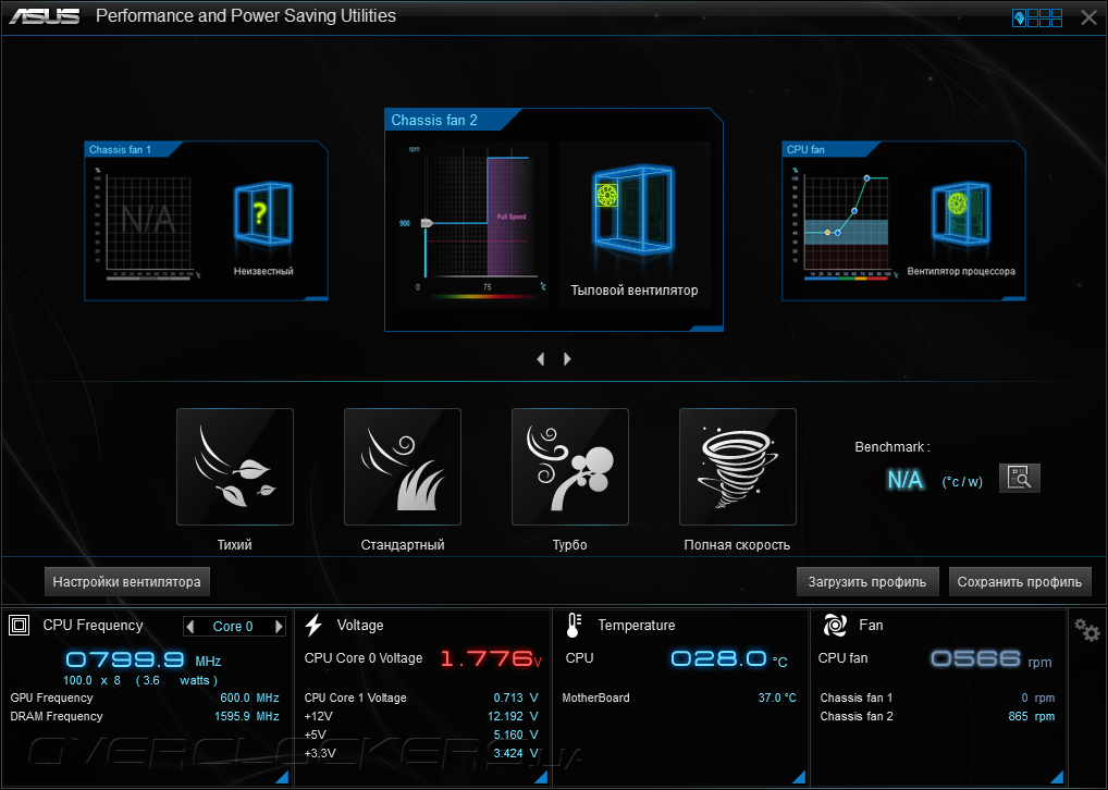 Наиболее интересный модуль из всех — Fan Xpert. Здесь полноценно можно настроить скорость вращения вентиляторов. Достигается это путём калибровки изделий, чтобы абстрактным процентам соответствовали реальные значения числа оборотов. По составленному паспорту затем можно выработать собственный алгоритм управления изделием, либо же зафиксировать обороты на комфортной отметке. Тогда при разогреве ЦП до 75 °C произойдёт автоматическое их повышение до максимально возможного. Расстраивает, что подключить можно лишь три вентилятора.