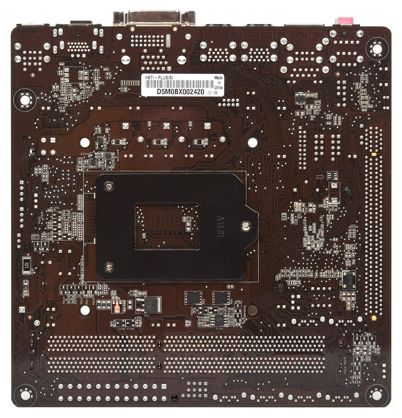 И хотя H87I-Plus лишена каких-либо дополнительных контроллеров, обычно занимающих место на текстолите, часть элементов все же пришлось переместить на обратную сторону PCB. Особое беспокойство вызывают компоненты, расположенные в непосредственной близости от отверстий для закрепления системы охлаждения ЦП. Впрочем, при установке входящего в состав нашего стенда охладителя SilverStone Heligon HE-01 они не стали преградой.