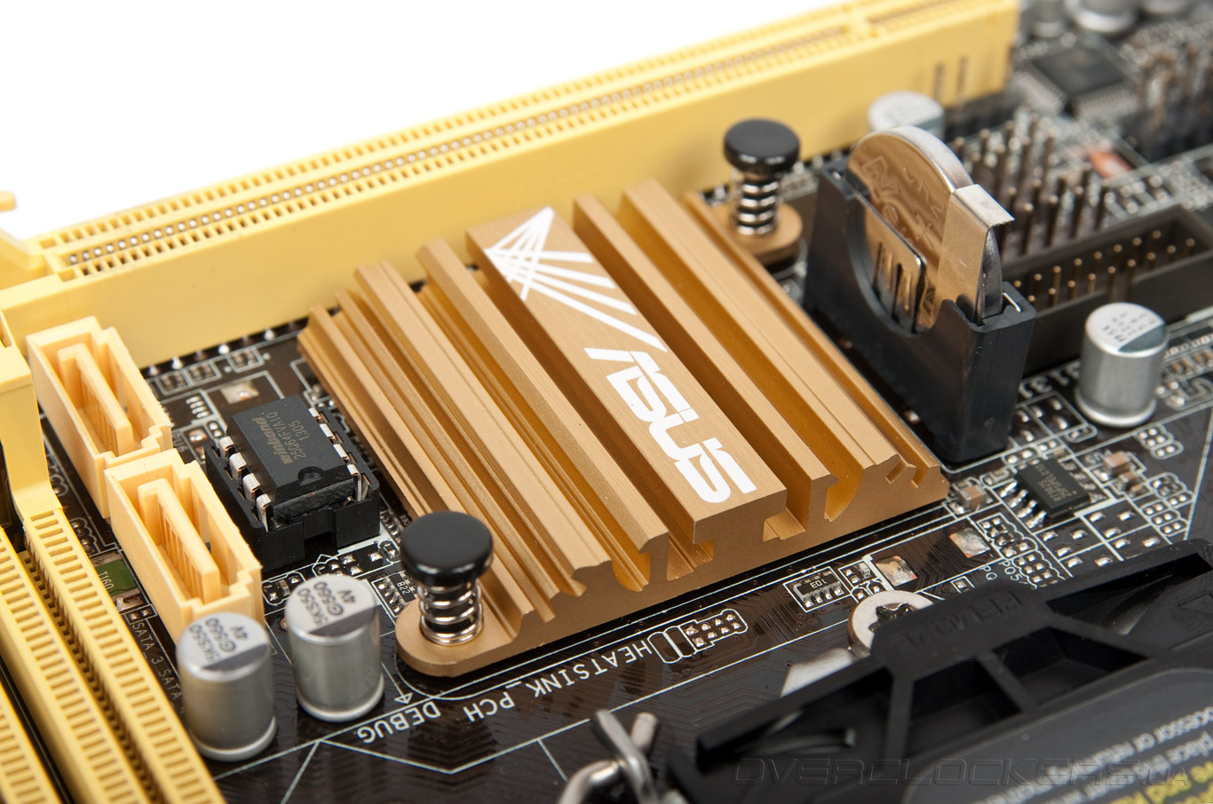 Для нужд охлаждения системной логики используется скромный по размерам ребристый радиатор, крепление которого выполняется подпружиненными пластиковыми «гвоздями». Со своими обязанностями он справляется без замечаний.