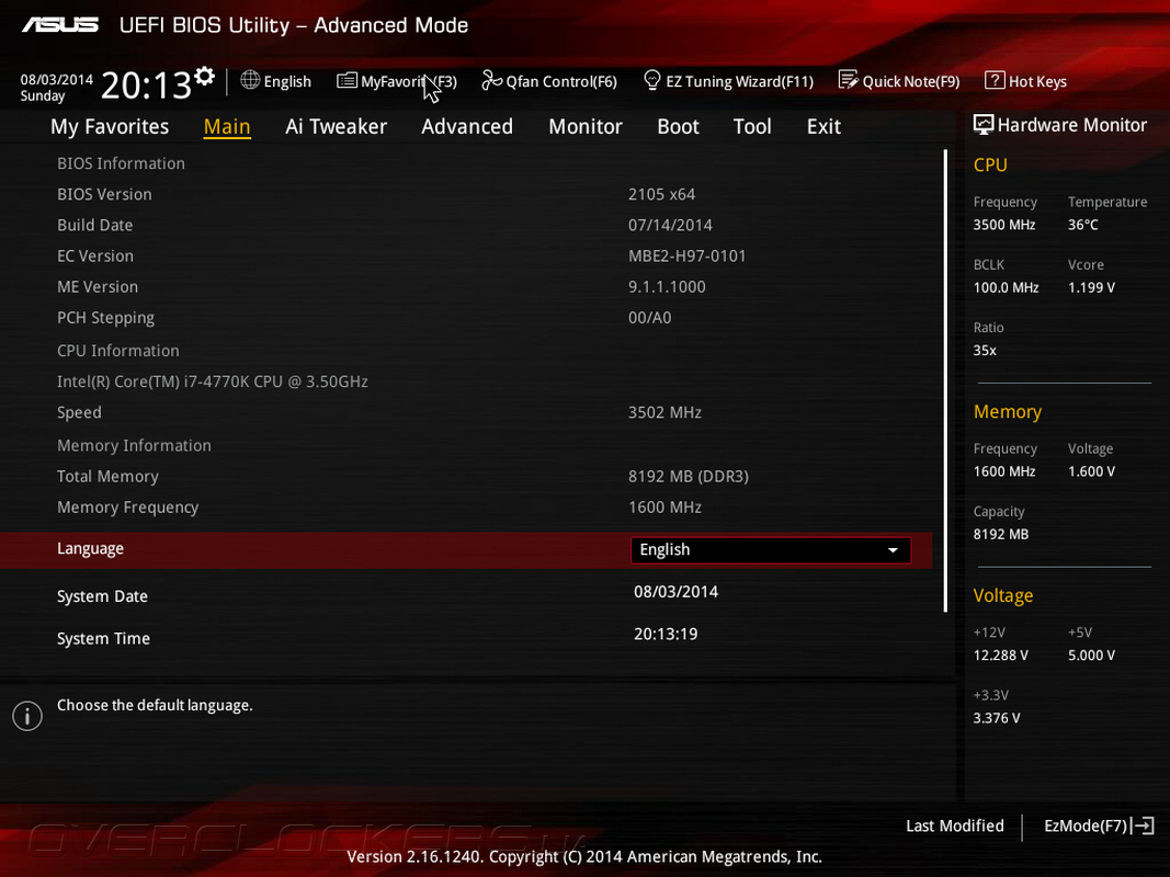 Материнская плата H97-Pro Gamer оснащена прошивкой, которая базируется на управляющем микрокоде UEFI разработки AMI. Интерфейс меню настройки поразительно напоминает «материнки» ASUS игровой серии Republic of Gamers, что лишний раз подчеркивает близость новинки к семейсту ROG. Прошивка имеет два режима работы: продвинутый Advanced и EZ Mode, в котором пользователям доступны только самые необходимые опции, такие как вывод информации о версии UEFI и центральном процессоре, отображение показаний системного мониторинга, установка даты и времени, а также задание порядка инициализации загрузочных устройств.