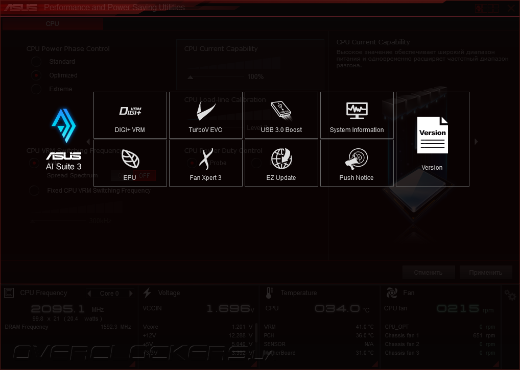 Программный модуль DIGI+ VRM служит для настройки цифровой подсистемы питания, а подпрограмма TurboV EVO отвечает за оверклокинг центрального процессора, регулировку напряжений и активацию автоматического разгона.