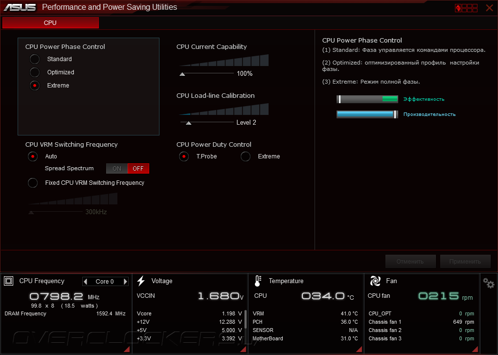 Меню настройки оснащено утилитой EZ Tuning Wizard, которая позволяет оптимизировать быстродействие в зависимости от модели использования персонального компьютера и типа системы охлаждения. Результатом работы этой функции является безопасный автоматический разгон.