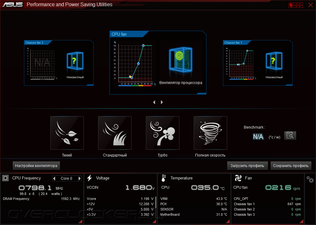 Из режима EZ Mode вызывается подпрограмма Q-Fan Tuning, предназначенная для настройки скоростей вращения вентиляторов, где пользователи могут выбрать один из четырех предустановленных профилей, либо задать режим работы вручную.