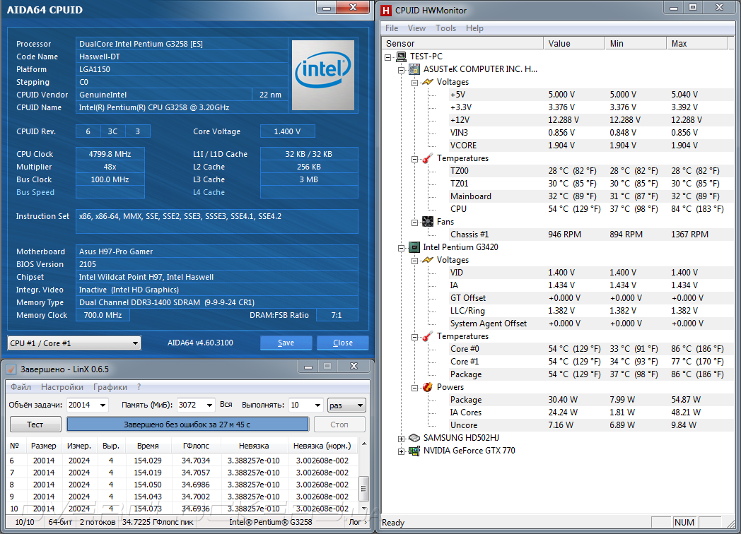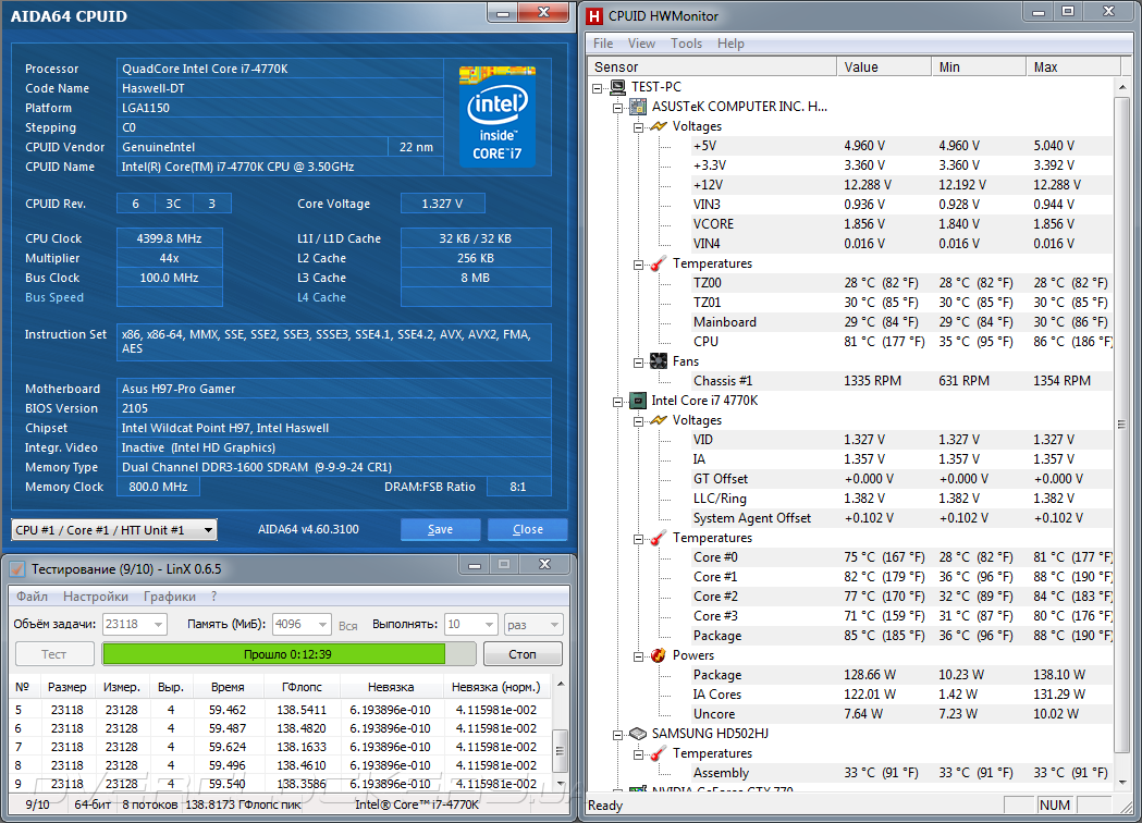Запуск стресс-теста LinX версии 0.6.5, в котором реализована поддержка инструкций AVX2.0, заставил снизить планку разгона, поскольку с предыдущими параметрами процессор мгновенно перегревался и включал режим пропуска тактов. В итоге, пришлось уменьшить напряжение, а вместе с ним и коэффициент умножения вычислительных ядер. Абсолютная стабильность была достигнута на частоте 4400 МГц, при которых процессору оказалось достаточно 1,325 В, что самым положительным образом отразилось на его температурном режиме.