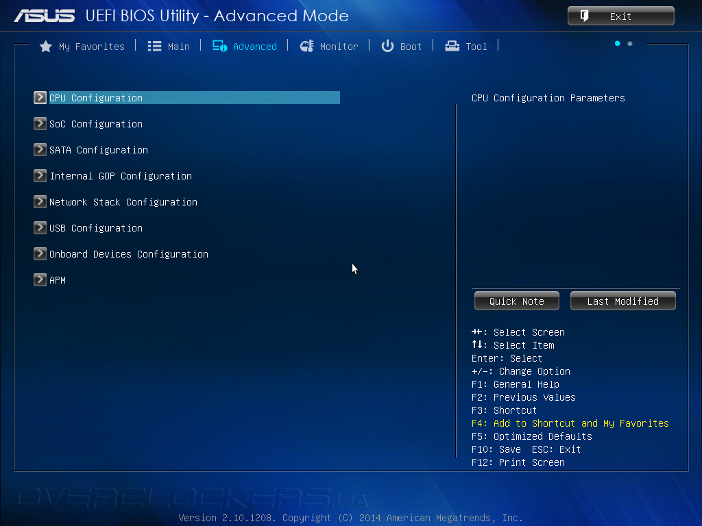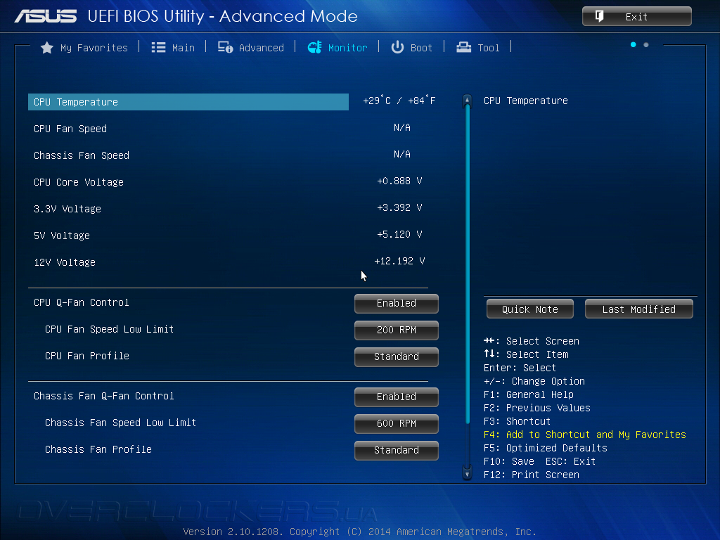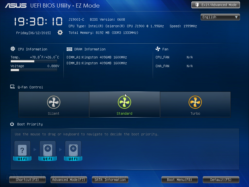 Как и большинство современных системных плат ASUS на J1900I-C в качестве прошивки используется микрокод UEFI c фирменным графическим интерфейсом. Отличительной особенностью меню настройки является наличие упрощенного режима EZ Mode, который отображает конфигурацию аппаратного обеспечения и выводит текущие показания мониторинга, позволяет задать дату и время, выбрать язык отображения меню, а также установить порядок инициализации загрузочных устройств и настроить работу вентиляторов.