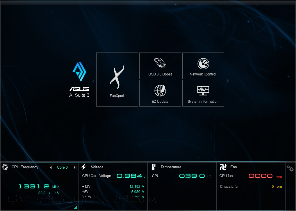 Вместе с материнской платой производитель предлагает программный продукт Ai Suite 3, который хорошо знаком нам из предыдущих обзоров продукции ASUS. В состав приложения входят несколько программных модулей, объединенных общим пользовательским интерфейсом. В нижней части окна отображается информационная панель, на которую выводятся показания аппаратного мониторинга.