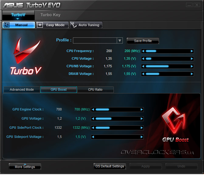 Программа ASUS TurboV EVO является фирменной утилитой для настройки и разгона системы. Своего рода аналог AMD Overdrive, в чем-то повторяющий функции последнего, в чем-то — дополняющий. Пользователь имеет возможность регулировать основные частоты и напряжения. Поддерживаются профили настроек. Это удобно. Можно создавать комбинации настроек для различных нужд. К примеру для игр и офисной работы требуются совершенно разные характеристики. Также предоставляется возможность регулирования параметров интегрированного видеоядра. Обратимся к официальному сайту: