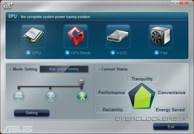 Утилита ASUS EPU является программным дополнением к «энергетическому процессору» с одноименным названием. В ней пользователь сможет задать быстродействие и энергопотребление своей системы, и оценить, сколько деревьев таким образом он сэкономил человечеству. Интерфейс приятен и прост. Актуальность программы, как и самой технологии в целом, сомнительна в условии наших цен на электроэнергию, однако она вполне может помочь спать спокойнее различным борцам за экологию.