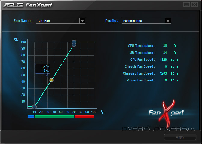 ASUS FanXpert — простенькая программка, основным назначением которой является мониторинг и управление оборотами системных вентиляторов. Имеется несколько предустановленных профилей для различных потребностей. Интерфейс, опять же, достаточно простой и понятный.