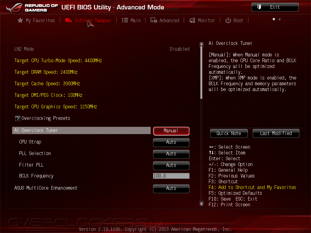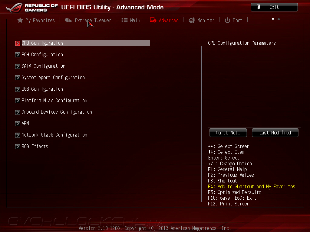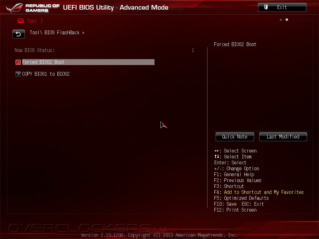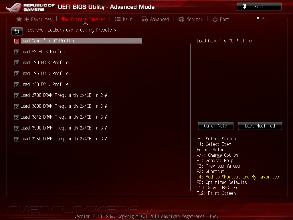 Прошивка Maximus VI Extreme базируется на управляющем микрокоде UEFI. Как и в других системных платах ASUS семейства ROG меню настройки обладает дружественным интерфейсом и богатыми возможностями для разгона. Несмотря на то, что все разделы UEFI Setup сгруппированы в логической последовательности, разработчик позаботился о пользователях и внедрил вкладку My Favorites, содержимое которой можно сформировать исходя из собственных предпочтений. Для заметок пригодится функция Quick Note, а нажав на кнопку Last Modified можно просмотреть историю изменения настроек.