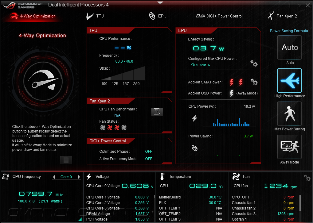 Для вывода показаний системного мониторинга и управления быстродействием в Ai Suite 3 служит модуль Dual Intelligent Processor 4. В нижней части окна выводятся значения напряжений, температур и скоростей вращений вентиляторов, а во вкладке 4-Way Optimization отображается комплексная информация о режиме работы системы, здесь же задаются профили энергопотребления.