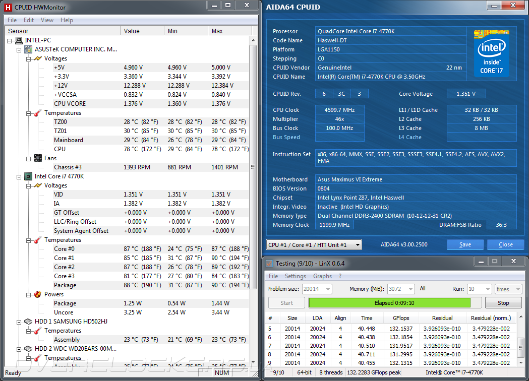 Для исследования разгонного потенциала ASUS Maximus VI Extreme мы использовали процессор Intel Core i7-4770K, который подвергся замене термоинтерфейса между кристаллом и крышкой теплораспределителя. Эта модификация помогла улучшить температурный режим, но, увы, практически не отразилась на его частотном потенциале. При использовании мощного воздушного кулера Thermalright Silver Arrow процессор достиг 4600 МГц при напряжении на вычислительных ядрах, равном 1,35 В. Во время эксперимента Uncore-часть функционировала на частоте 4200 МГц с напряжением 1,2 В, хотя, её разгон практически не отражается на общем уровне быстродействия. В таком режиме система проходила стресс-тест LinX с поддержкой инструкций AVX, а температура вычислительных ядер была в пределах нормы.