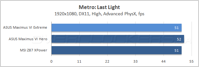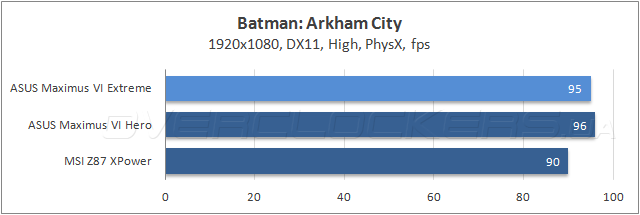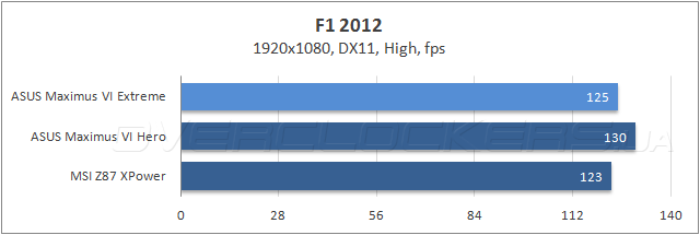 При тестировании в 3D-играх Maximus VI Extreme показала отличные результаты за исключением гоночного симулятора F1 2012, где новинка неожиданно проиграла своей младшей сестре. Впрочем, речь идет об отставании в несколько fps, что никак не отразится на комфортности игрового процесса.
