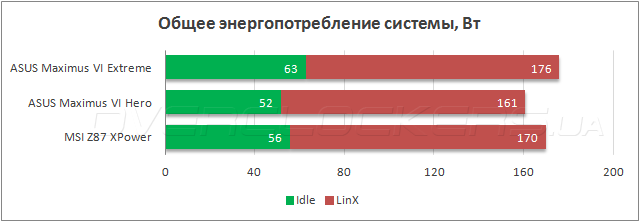 Вне зависимости от режима работы ASUS Maximus VI Extreme оказалась самой прожорливой. При отсутствии нагрузки она проиграла Maximus VI Hero более 10 Вт, тогда как при максимальной нагрузке разница увеличилась до 15 Вт. Даже на фоне флагманской MSI Z87 XPower, которая не отличается особой экономичностью, героиня сегодняшнего обзора выглядела не слишком энергоэффективной.