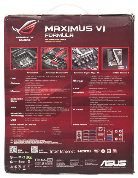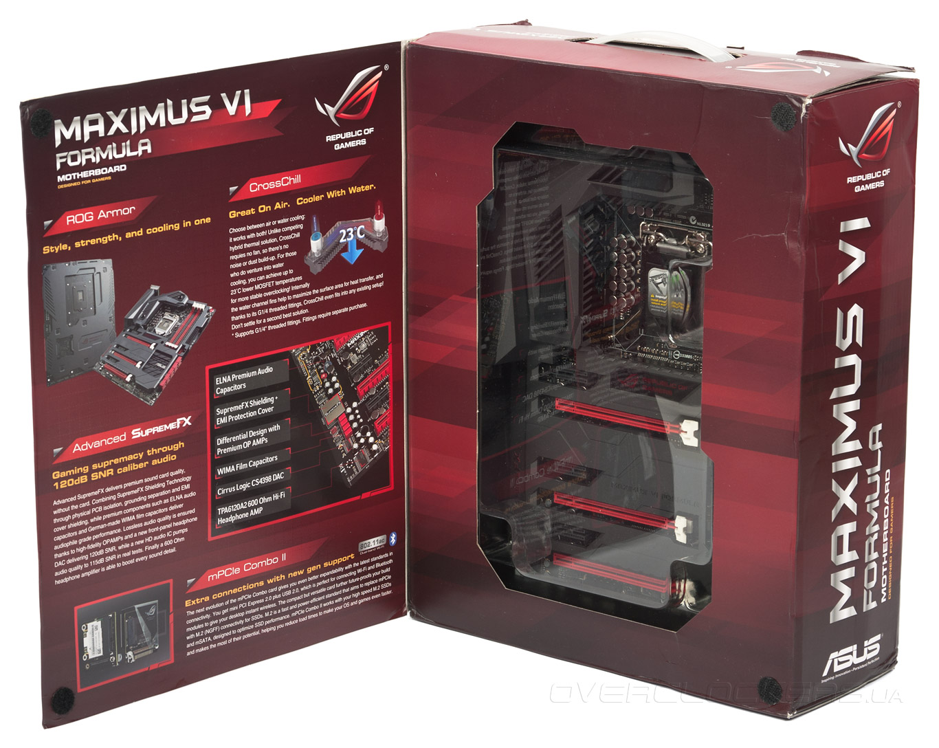 Системная плата Maximus VI Formula упакована в массивную картонную коробку, снабженную удобной ручкой для переноски. В её облике без труда узнается продукт ASUS из серии ROG.