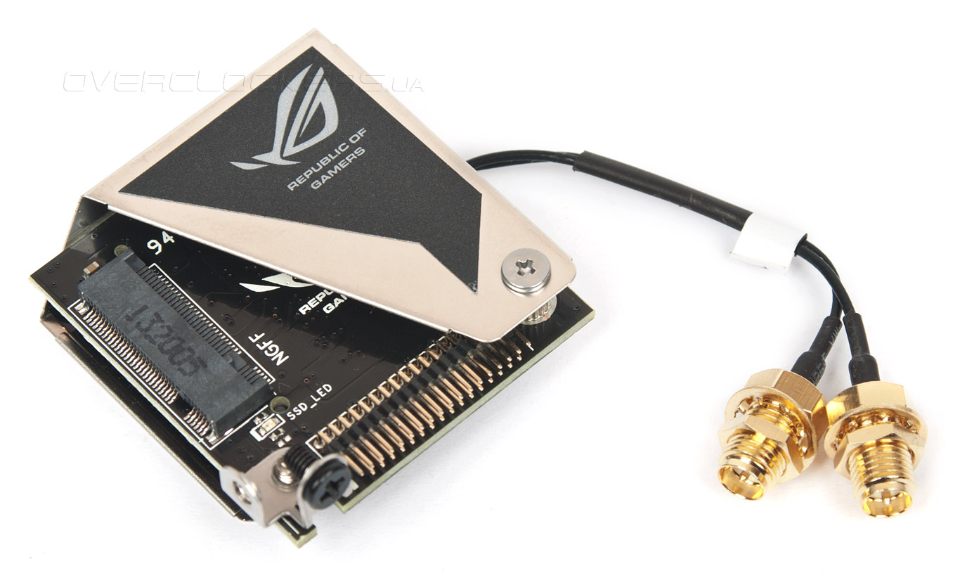 В отличие от Maximus VI Extreme новинка не комплектуется внешним модулем для управления и мониторинга OC Panel и кабелем ROG Connect. Зато среди дополнительных принадлежностей есть дочерняя плата mPCIe Combo II, которая оснащена слотом M.2 (NGFF, Next Generation Form Factor) для установки миниатюрных SSD, и разъемом mini-PCI Express 2.0 x1.