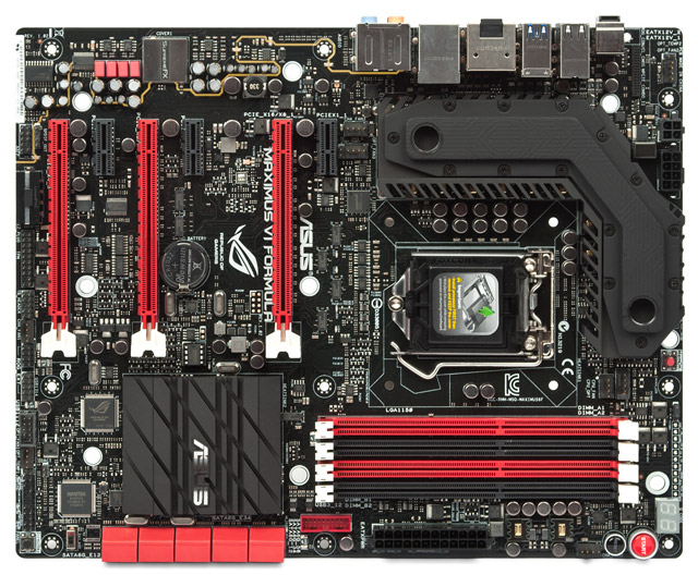 Без кожуха системная плата Maximus VI Formula выглядит не столь необычно. Её размеры составляют 305x244 мм, что соответствует формату ATХ, а все основные компоненты и разъемы расположены на привычных местах.