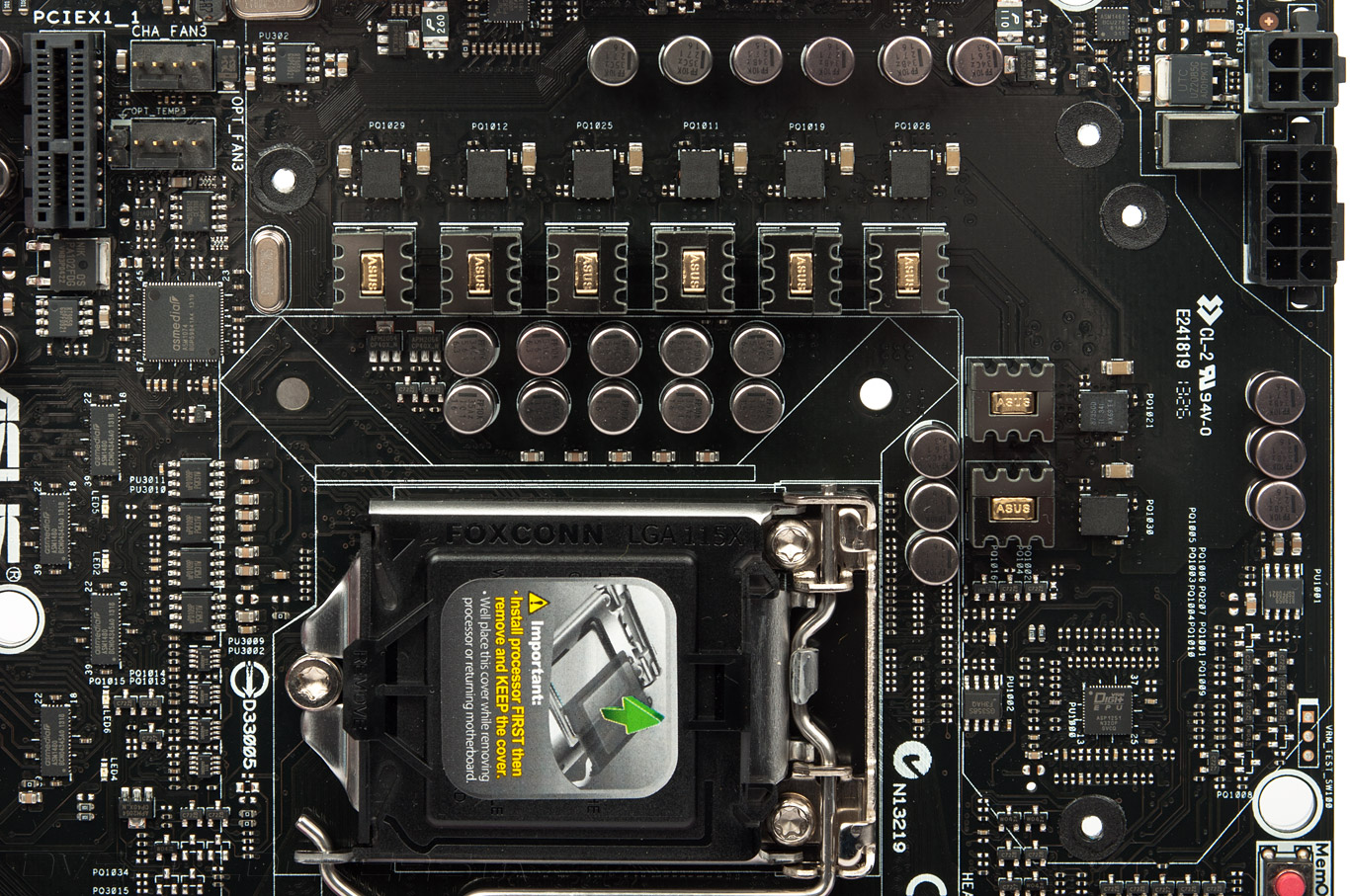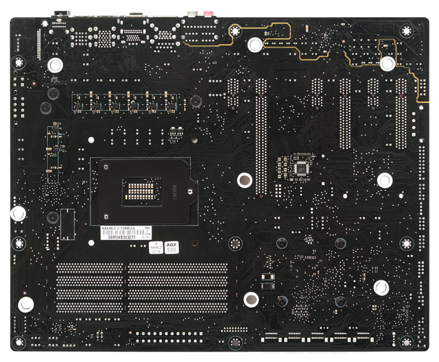 С обратной стороны в районе процессорного сокета видны несколько микросхем, но их размещение не должно препятствовать монтажу систем охлаждения с массивными усилительными пластинами. Прямо по центру печатной платы находится чип, отвечающий за работу технологии ROG.