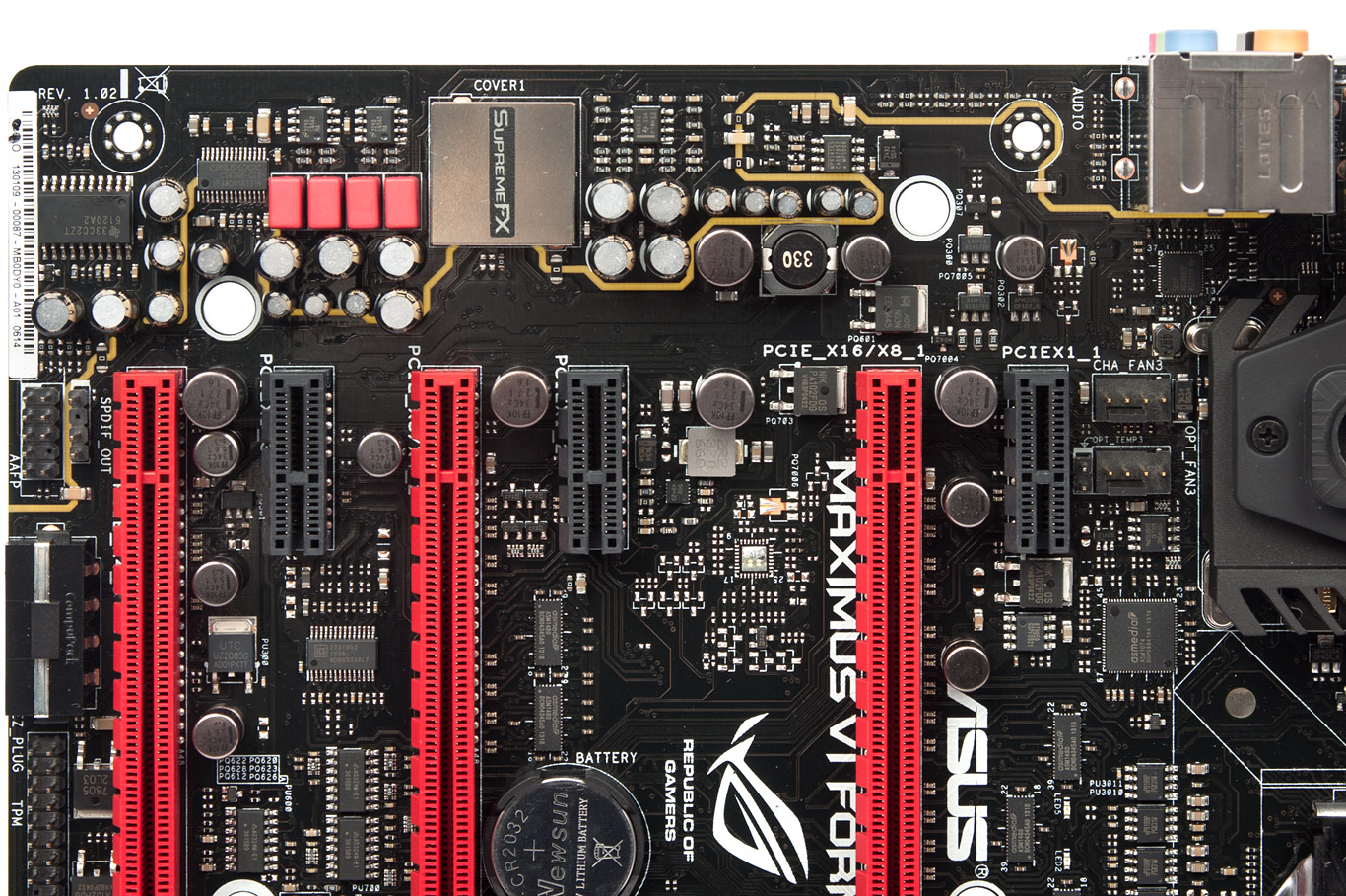 Кожух выполнен из специального атермического материала и по задумке создателей ROG Armor должен предотвращать нежелательный нагрев материнской платы, например, горячим воздухом из систем охлаждения мощных видеокарт. Для установки последних ASUS Maximus VI Formula располагает тремя разъемами PCI Express 3.0 x16, которые могут работать в режимах «х8+х8» или «х8+х4+х4», обеспечивая поддержку конфигураций AMD CrossFireX и NVIDIA SLI. Для работы плат расширения служат три разъема PCI-E 2.0 x1.