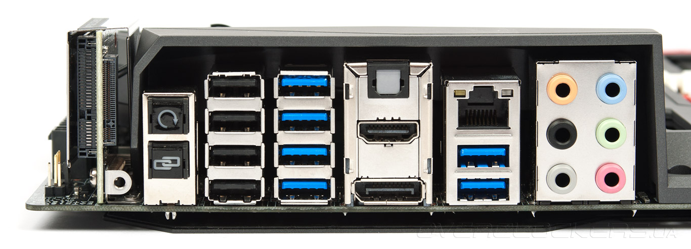 За работу гигабитной локальной сети отвечает контроллер Intel I217V. Поддержка восьми портов USB 3.0 реализована следующим образом: пара чипсетных каналов выведена на заднюю панель, еще два сделаны в виде внутренних разъемов, а к двум другим подключен концентратор ASMedia ASM1074, который добавляет поддержку четырех портов USB 3.0. В итоге, на задней панели материнской платы расположились: