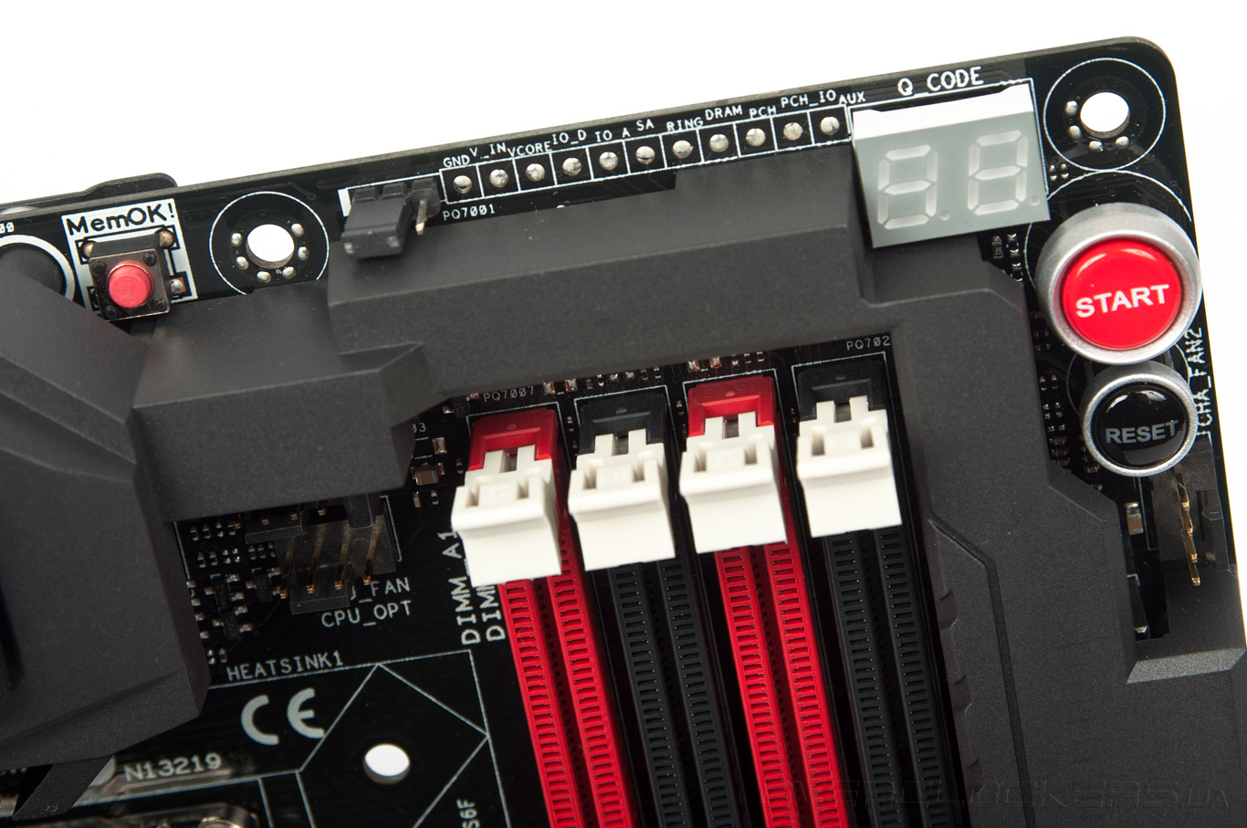 Работу ASUS Maximus VI Formula в условиях открытого стенда облегчают клавиши включения и перегрузки, кнопка MemOK! и контактные площадки для измерения напряжения, а также индикатор кодов POST.
