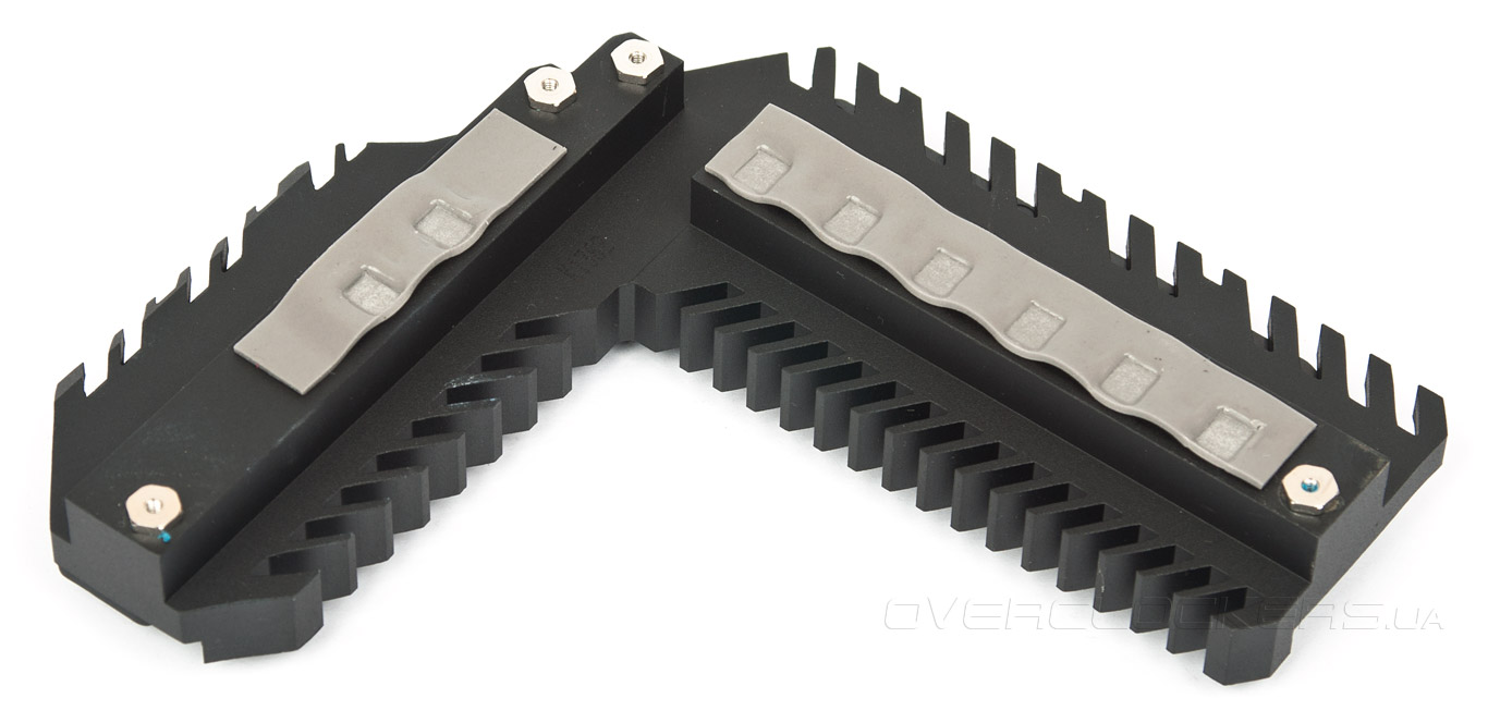Основание радиатора-водоблока контактирует с силовыми элементами через толстые термопрокладки, а надежный прижим обеспечивается винтовым креплением.