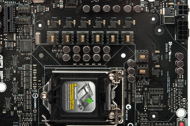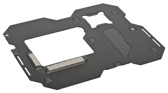 Усилительная пластина, расположенная с обратной стороны, играет роль каркаса жесткости, предотвращая деформацию текстолита. Последнее особенно актуально при эксплуатации системной платы в условиях открытого стенда.
