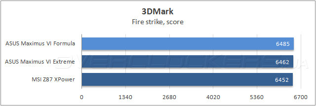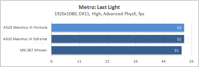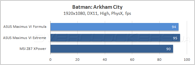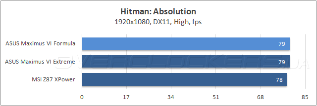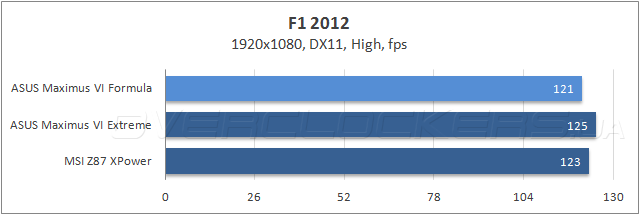 В реальных игровых приложениях ASUS Maximus VI Formula обеспечила отличную частоту смены кадров, лишь в симуляторе F1 2012 наблюдалось небольшое отставание fps от «старшей сестры».