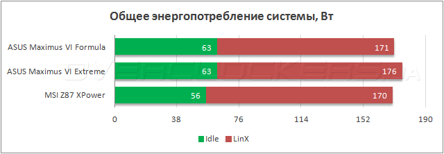 По части энергоэффективности ASUS Maximus VI Formula продемонстрировала не самые лучшие результаты. В простое её потребление энергии заметно превысило показатели Z87 XPower, тогда как в нагрузке новинка показала экономичность практически на уровне флагманской модели MSI.