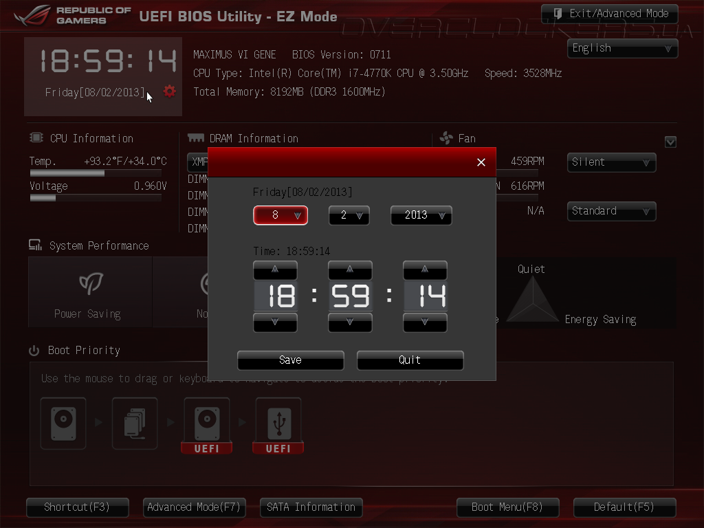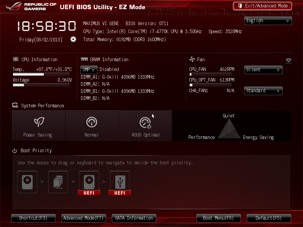 В этом режиме можно регулировать быстродействие системы, включать профили Х.М.Р. для модулей ОЗУ, а также настраивать скорости вращения вентиляторов. Среди возможностей EZ Mode числится установка порядка загрузки с дисковых накопителей и выставление системных даты и времени.