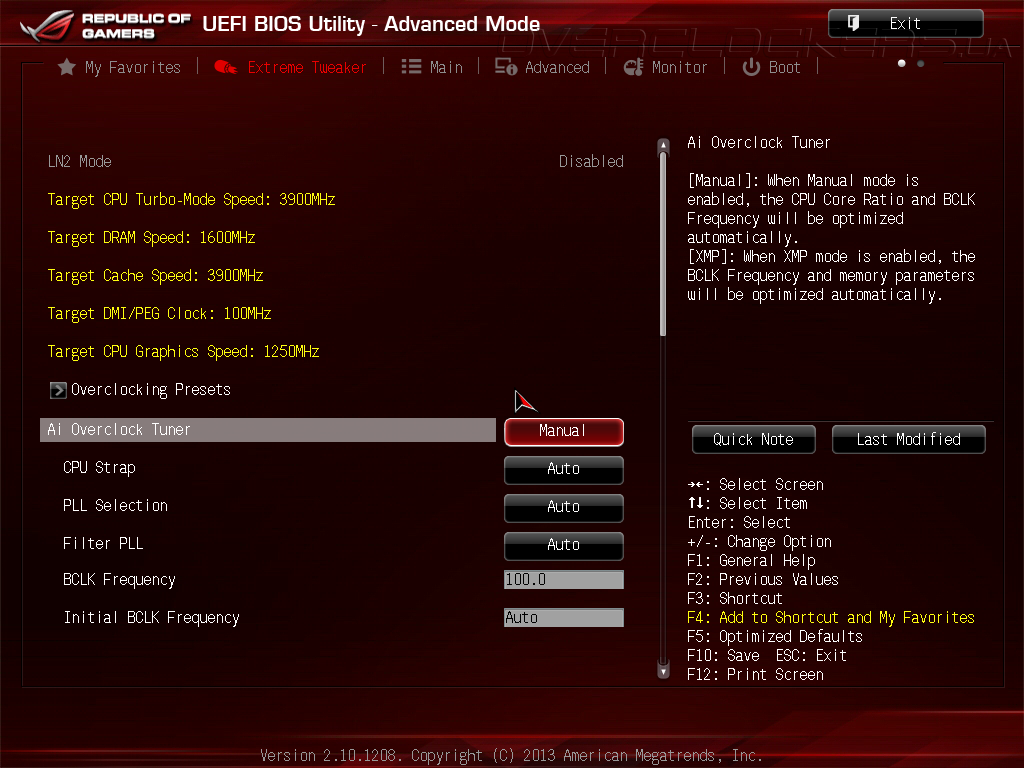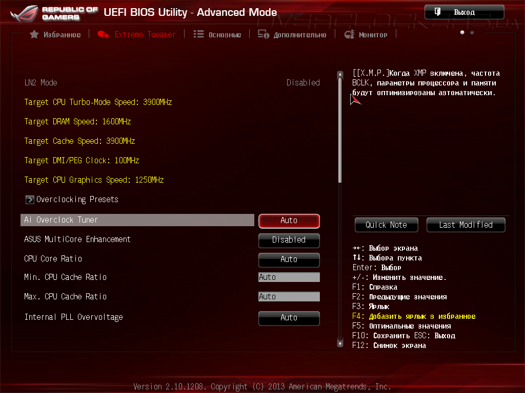 По большому счету, режим EZ Mode предлагает набор настроек, которых достаточно для первичной конфигурации системной платы. Но не для этого покупают модели из серии Republic of Gamers, стихия которых — работа в режиме разгона, возможном при использовании расширенного режима UEFI Setup — Advanced Mode. В разделе Extreme Tweaker отображаются текущий режим работы центрального процессора и модулей ОЗУ, а также сосредоточены все основные параметры быстродействия. Среди них регулировка базовой частоты, задание параметра CPU Strap, позволяющего поднять BCLK со штатных 100 МГц до 125 МГц, 167 МГц или 250 МГц, а также опции PLL Selection и Filter PLL, регулировкой которых достигаются максимальные значения опорной частоты.