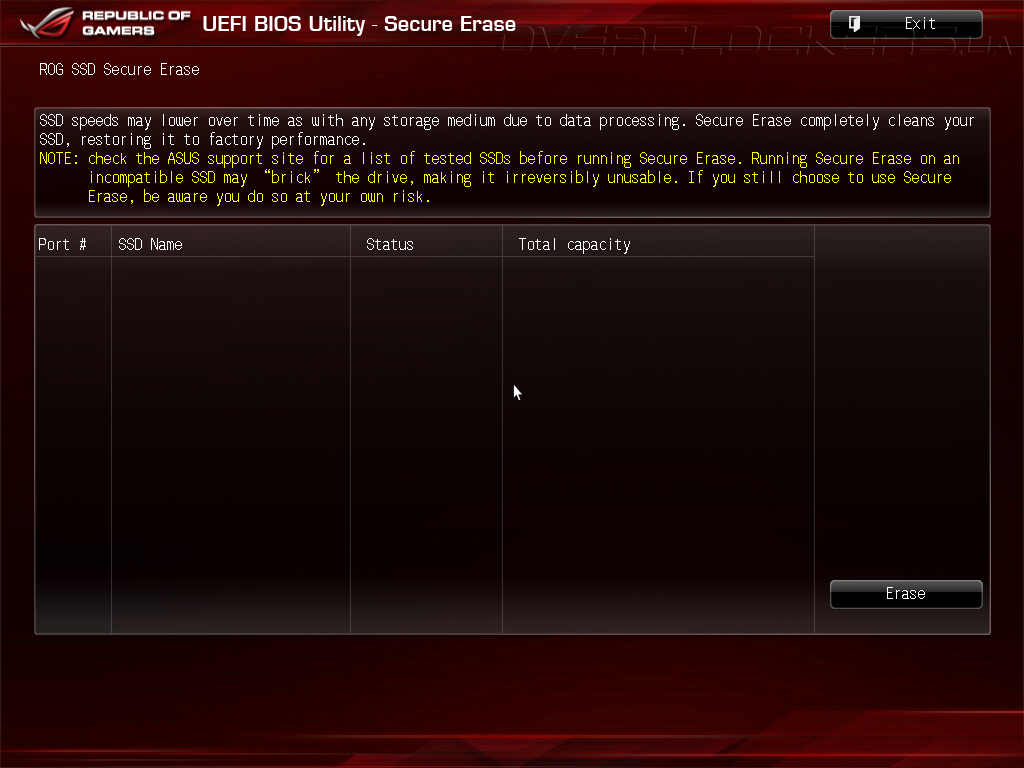 UEFI Setup новинки располагает рядом дополнительных возможностей, таких как программа обновления управляющего микрокода, или функция очистки твердотельных накопителей, восстанавливающая быстродействие SSD до первоначального уровня.