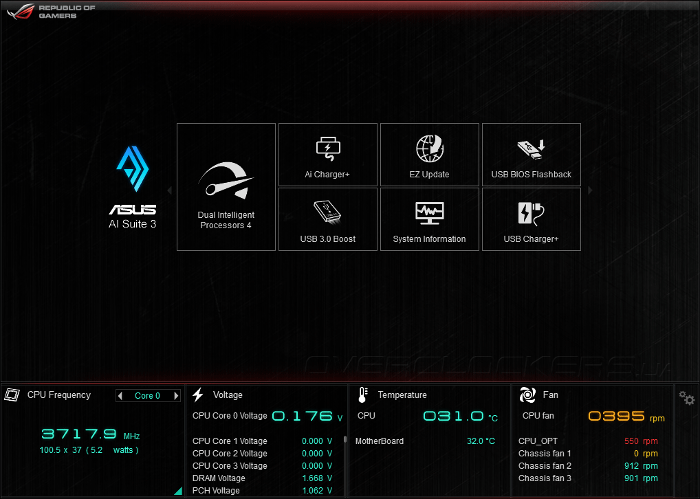 Набор ПО, поставляемого вместе с материнской платой ASUS Maximus VI Gene, включает в себя программный продукт AI Suite 3, предлагающий возможности разгона, аппаратного мониторинга и ряд других полезных функций. В нижней части главного окна отображаются показания диагностических датчиков, а также задаются пороги срабатывания оповещения.