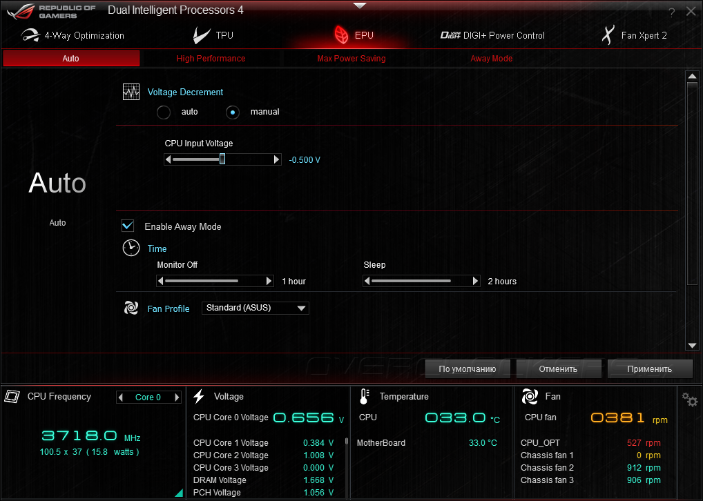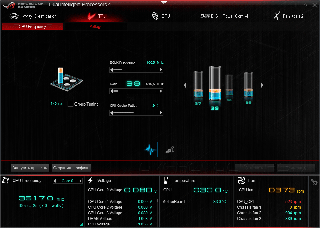 Для управления быстродействием, энергосбережением и режимом работы вентиляторов служит утилита Dual Intelligent Porcessor 4. В её главном окне отображается панель управления 4-Way Optimisation, на которую выводится текущее состояние работы компонентов и предоставляется возможность выбора режима энергосбережения.