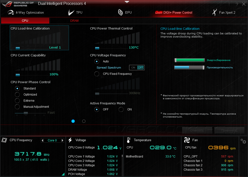 Для управления и контроля энергосбережения служит вкладка EPU, а в меню DIGI+ Power Control можно выполнить конфигурирование цифровой подсистемы питания.