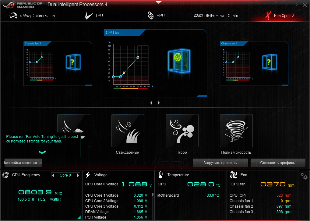 Программа AI Suite 3 обладает развитыми возможностями по управлению вентиляторами. Для этого во вкладке Fan Xpert 2 доступны автоматический и ручной режим регулировки скоростей вращения крыльчаток, причем, в последнем случае обороты можно связать с изменением температур, или зафиксировать на нужном уровне.