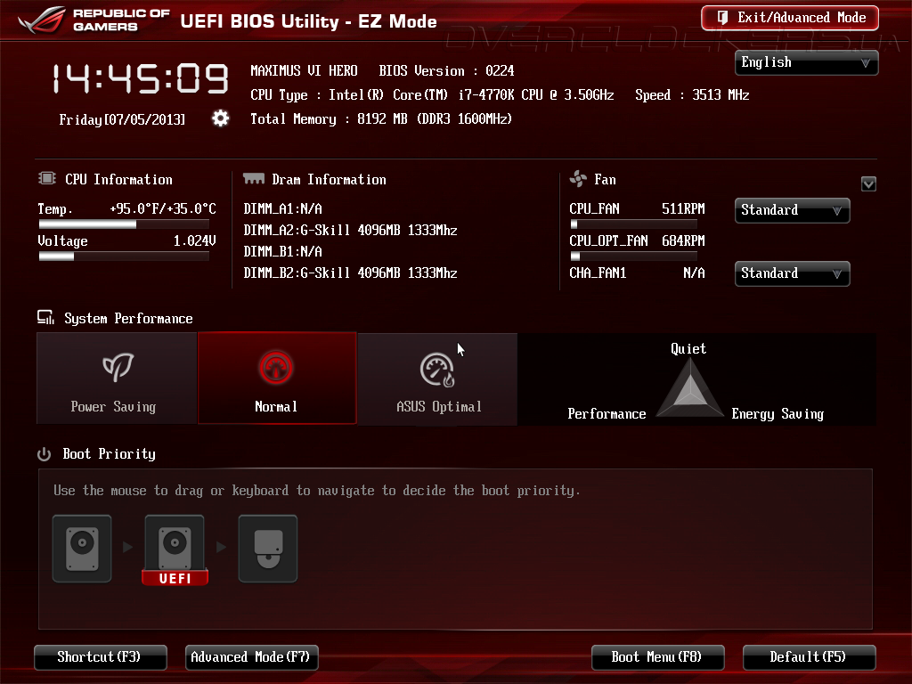 Прошивка героини сегодняшнего обзора базируется на управляющем микрокоде UEFI разработки AMI. Штатный интерфейс меню настройки Aptio заменен на фирменную оболочку ASUS, имеющую упрощенный режим EZ Mode, в котором пользователи могут установить дату, время и язык отображения меню, активировать профили ОЗУ X.M.P., задать уровень быстродействия, а также настроить скорости вращения вентиляторов. Здесь же отображаются основные показатели системного мониторинга.