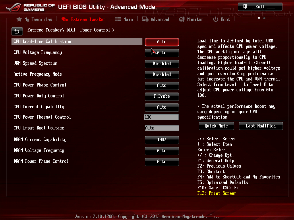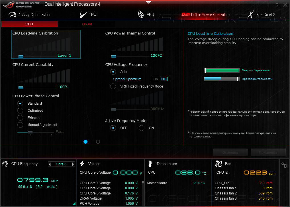 Параметры цифровой подсистемы питания сосредоточены в подменю DIGI+ Power Control. Здесь задается режим работы преобразователя напряжения, например, функция Load line calibration, препятствующая падению напряжения центрального процессора в нагрузке, частота переключения силовых элементов VRM, их защита от перенапряжения, перегрева и превышения силы тока. Отдельно регулируются настройки преобразователя питания модулей ОЗУ.