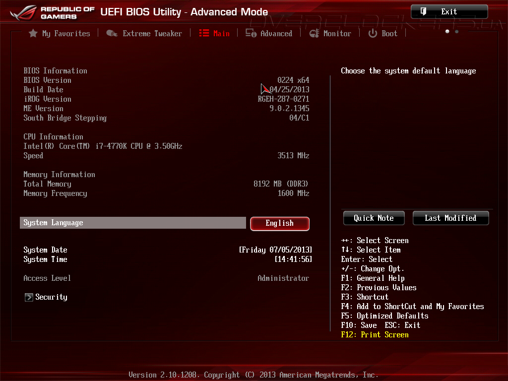 В следующем разделе прошивки — Main —выводится информация об управляющем микрокоде, отображаются параметры работы процессора и ОЗУ, меняется язык отображения меню, а также задаются системные дата и время.