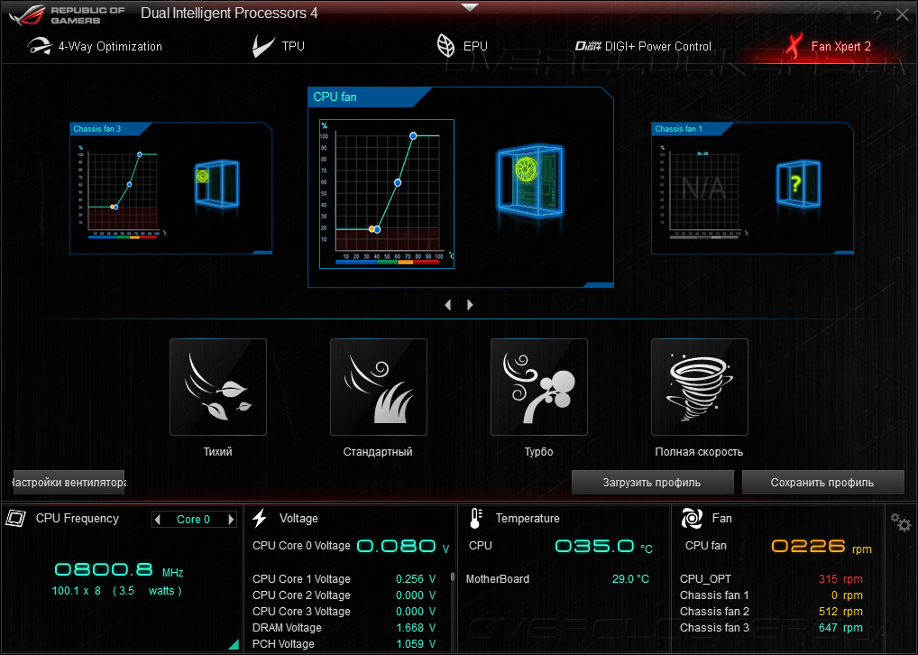 Для регулировки скоростей вращения вентиляторов служит раздел Fan Xpert 2. На первом этапе пользователям предлагается определить расположение и откалибровать показания тахометрических датчиков или же выбрать один из четырех предустановленных профилей работы.