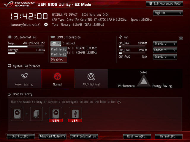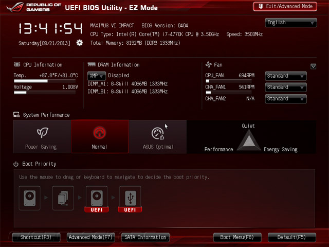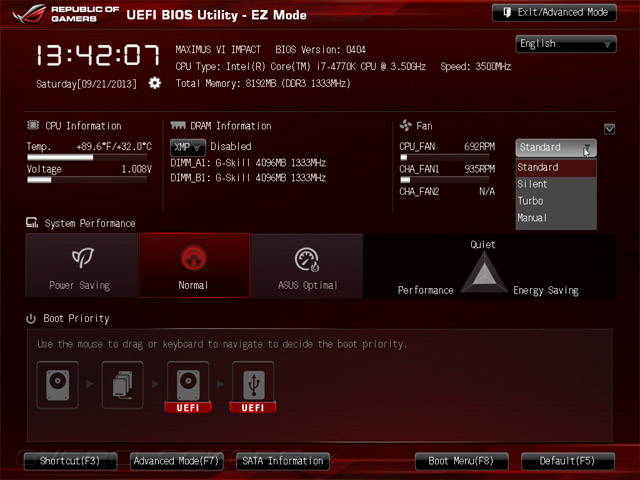 Прошивка ASUS Maximus VI Impact базируется на управляющем микрокоде AMI, внешний вид и функциональность меню настройки совершенно не отличаются у системных плат ASUS серии Republic of Gamers, рассмотренных нами ранее. UEFI Setup имеет режим EZ Mode, который служит для настройки базовой функциональности и контроля показаний системного мониторинга. В этом режиме пользователи могут задавать дату и время, выбирать режим быстродействия и порядок загрузочных устройств, активировать профили X.M.P, а также настраивать работу вентиляторов.