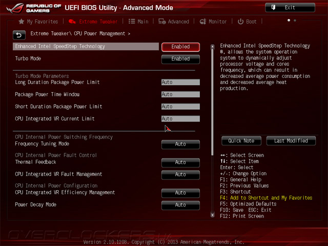 Вкладка CPU Power Management, как следует из названия, отвечает за настройку энергопотребления центрального процессора. В этой вкладке находится управление интегрированным регулятором напряжения, технологией Intel Turbo Boost, а также функциями энергосбережения.