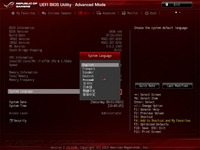 Продолжает наше знакомство с UEFI Setup новинки раздел Main, в котором выводится информация о версии управляющего микрокода, задаются системные дата и время. Здесь же находится меню выбора языка.