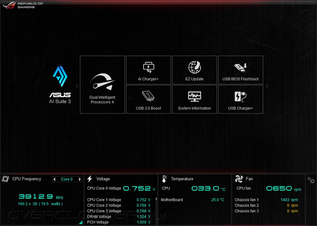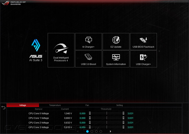 Как и все другие системные платы ASUS семейства Republic of Gamers наша Maximus VI Impact комплектуется DVD-диском со всеми необходимыми драйверами и набором полезных программ, среди которых имеется Ai Suite 3. Данное ПО объединяет в едином интерфейсе множество функций, но мы остановимся на тех, что обеспечивают управление разгоном. В нижней части окна выводятся показания датчиков системного мониторинга, и задается срабатывание сигнализации о достижении пороговых значений.