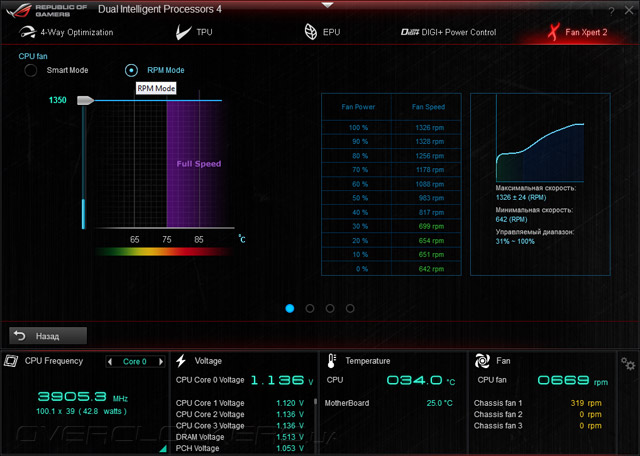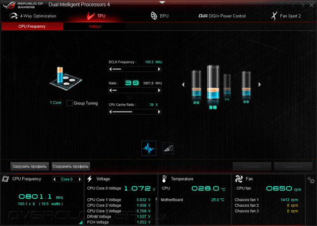 За настройки параметров быстродействия отвечает утилита Dual Intelligent Processor 4, в её главном окне отображается сводная информация о режиме работы системной платы. Здесь же можно запустить функцию 4-Way Optimization, которая автоматически настраивает быстродействие и энергопотребление в зависимости от сценария использования.