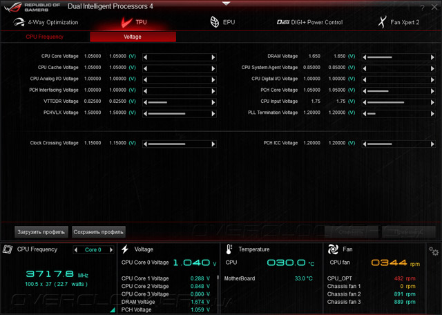 Вкладке TPU отвечает за разгон и управление напряжениями питания.
