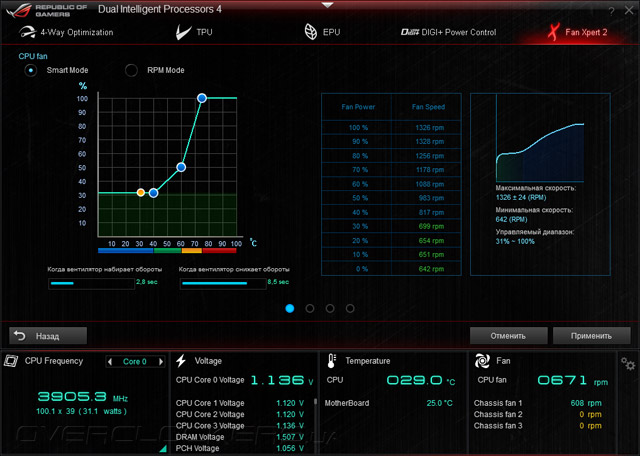Наконец, для управления частотой вращения вентиляторов служит утилита Fan Xpert 2. Она дает возможность настроить алгоритм работы «карлсонов» в зависимости от температуры центрального процессора или вручную задать скорость любого из четырех вентиляторов.