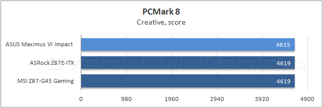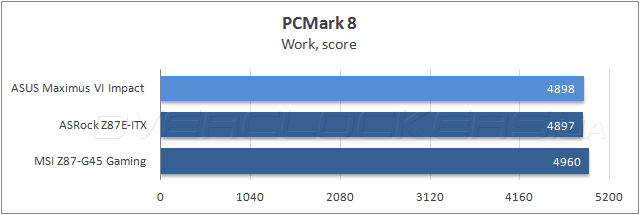 В комплексном тестовом пакете PCMark 8 среди соперниц снова наблюдается примерный паритет, а значит, что в сценариях повседневного использования ASUS Maximus VI Impact способна обеспечить отличный уровень быстродействия.